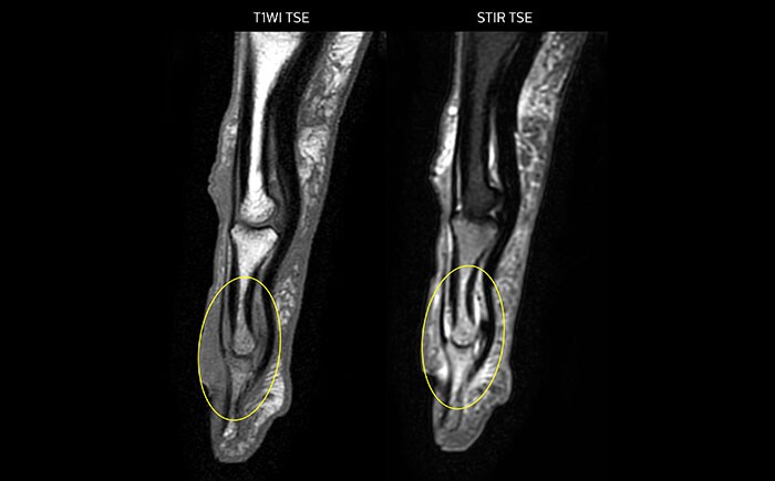 MRI of the finger with high SNR and good resolution in a 10 cm field of view on Prodiva 1.5T. The diagnosis in this 63-year-old patient is bone elasmanosis.