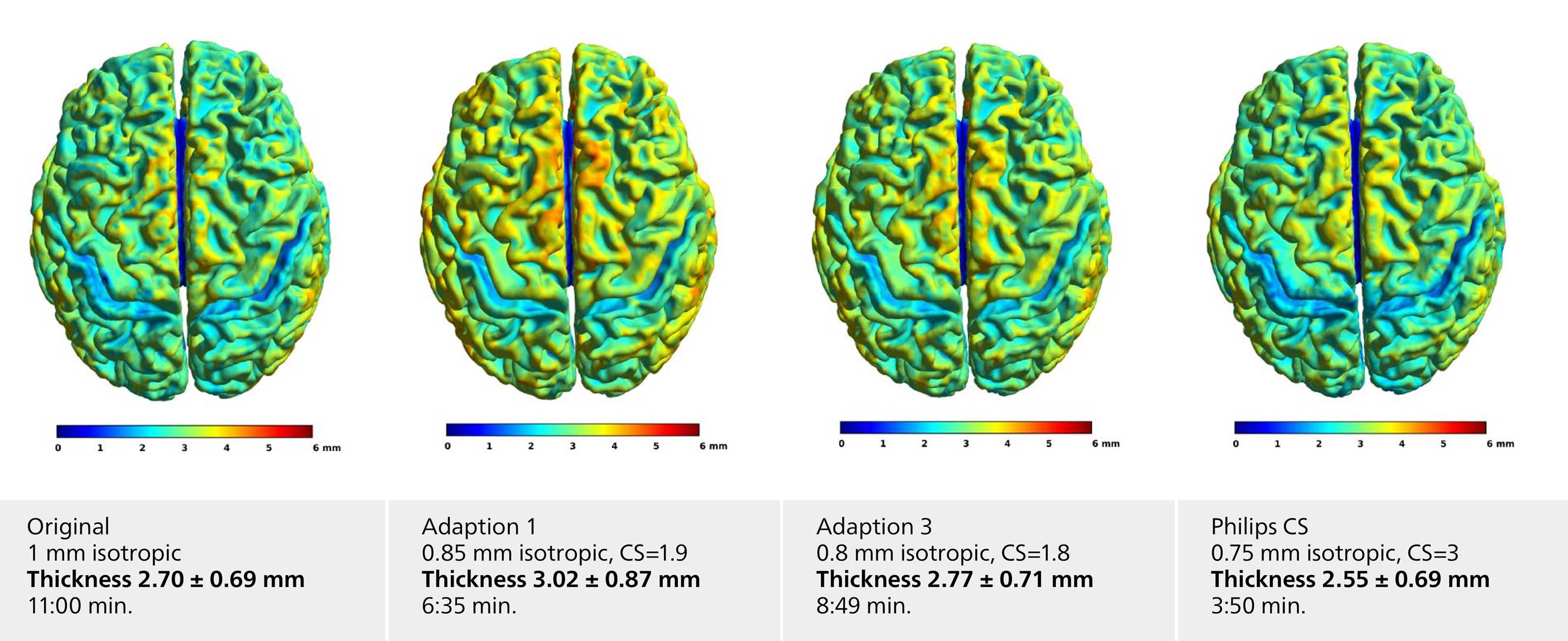 The neuroscience team compared their standard T1 brain morphometry sequence with alternate protocols facilitating Compressed SENSE. Selected examples shown here include adaption 1 with moderate CS=1.9, higher voxel resolution (0.85 mm), adaption 3 with CS=1.8 and 0.8 mm isotropic voxel size and the Philips protocol database default with CS=3.0 and 0.75 mm isotropic voxel size. All protocols resulted in comparable cortical thickness results with a slight decrease for higher CS-factors.